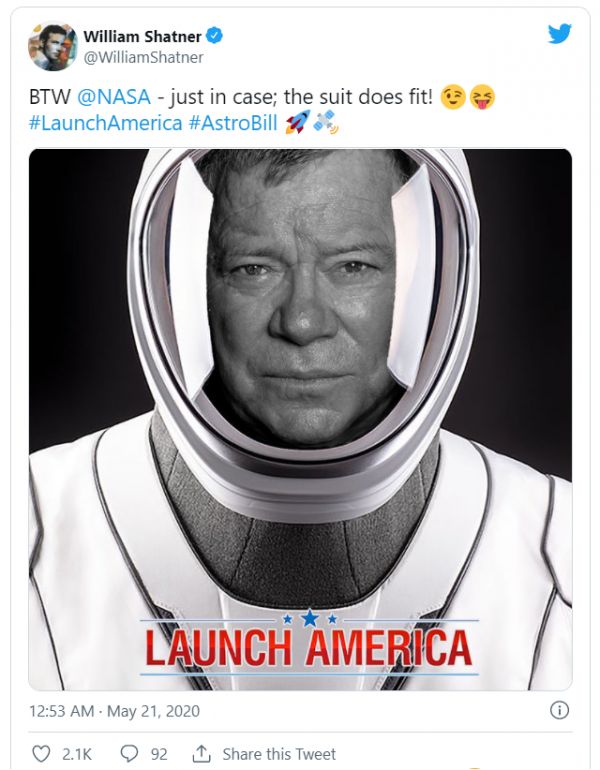 Shatner在社交媒体上也拥有超高的人气,Twitter粉丝超过240万。实际上,尽管年事已高,但他一直都毫不掩饰自己对太空飞行的渴望。