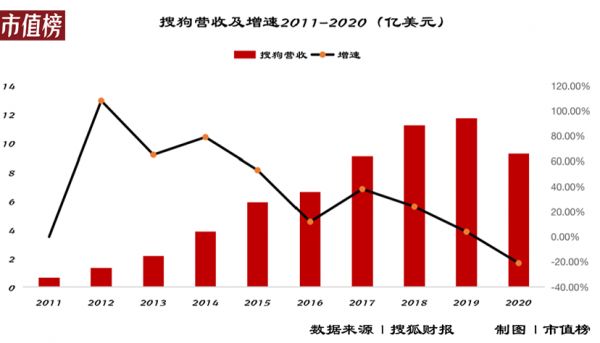 但这并不意味着搜狗进入一个快速发展的阶段,搜狐整体的营收在2015年以后出现负增长,再往后也近乎停滞,也就是说,搜狗营收占比的增加,实际上是在搜狐不断没落的情况下体现出来的。