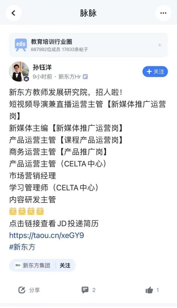 而在职场社交平台“脉脉”上,一名认证为“新东方HR”的员工在9月24日发帖,称要招聘“短视频导演兼直播运营主管”。