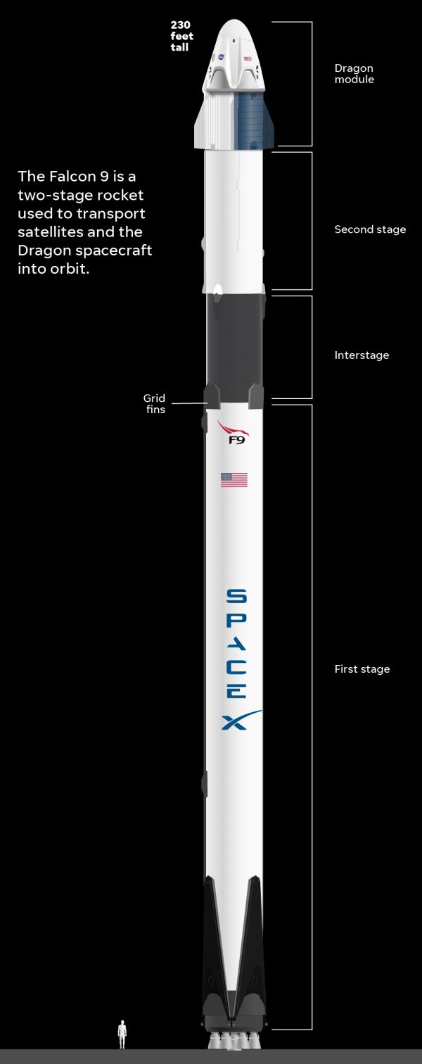 译者注:SpaceX公司的“灵感4”发射任务,是由猎鹰9号火箭(Falcon 9)执行的。整个火箭从下往上依次由一级推进器、级间段、二级推进器和载人龙飞船组成。其中,宇航员就坐在载人龙飞船中,其顶部还可以打开,以方便全方位欣赏星空美景。这一设计,也完爆维珍银河和蓝色起源,他们的飞船只能通过小窗户放眼宇宙。