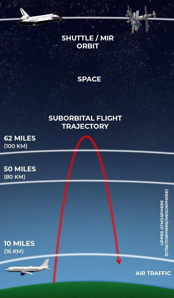 译者注:布兰森和贝佐斯完成的是亚轨道飞行。亚轨道高度一般指约20至100公里的高度,介于飞机和卫星的飞行高度之间。亚轨道飞行一般指飞行器能达到约100公里(甚至超过100公里)的亚轨道高度。同时,飞行器的速度又不够快,不足以一直停留在这个区域空间中。只要飞行器的速度低于第一宇宙速度(即28000公里/小时),不管它飞多高,只是在做抛物线飞行任务,最终都会降落到地面。总之,只要速度不够快,不足以在地球轨道上停留的,都可看作是亚轨道飞行。