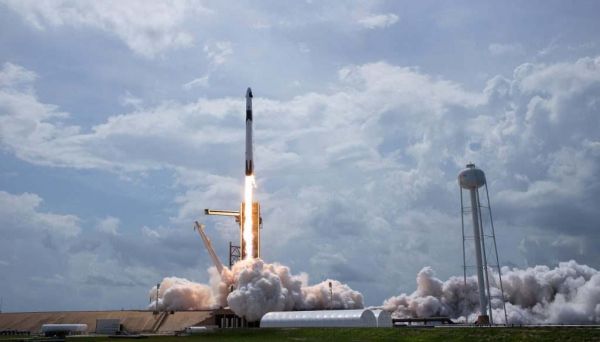 搭载载人龙飞船示范2号(DM-2)的猎鹰9号运载火箭在肯尼迪航天中心发射台发射升空。图片来源:NASA/Bill Ingalls