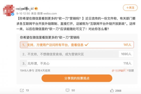 不久之前,就有一位微博博主发起了一轮投票“你希望在微信里看到更多的‘砍一刀’营销吗?”结果87%的用户选择了“不支持,不想微信变卖场,成为营销灾区”。虽然该调查存在着诱导用户的嫌疑,但也反映了部分网友切切实实的担忧。