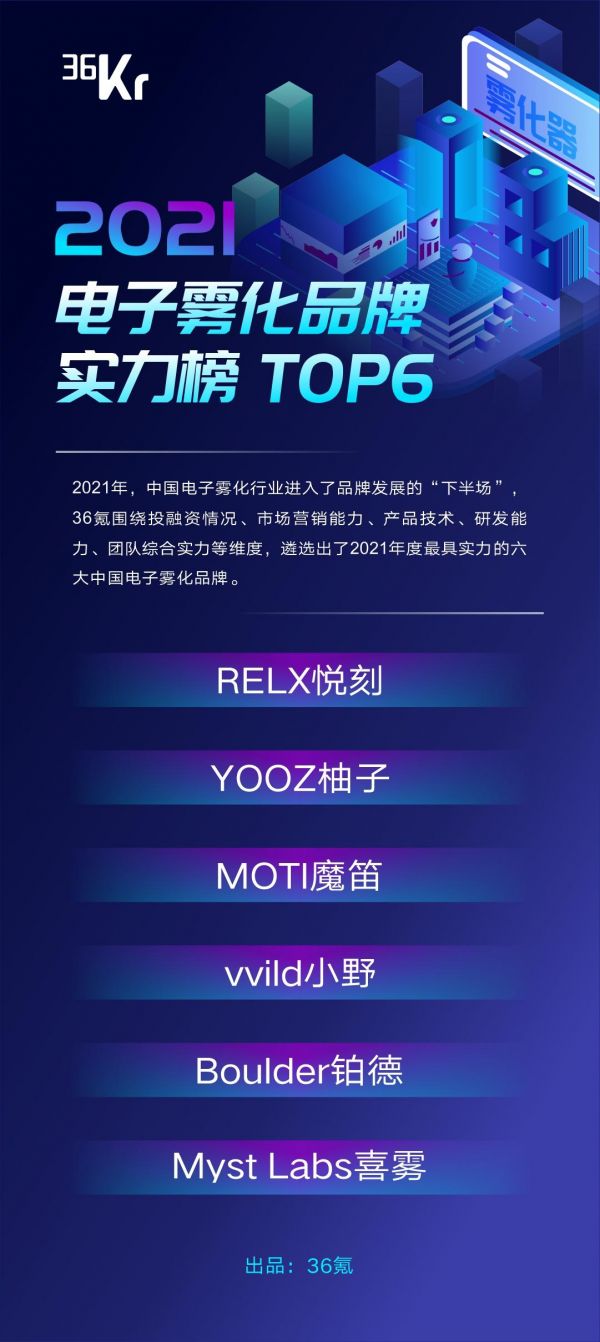 在过去近三年的观察周期中,36氪持续跟进了中国电子雾化行业的发展历程,并围绕投融资情况、估值/市值、销售网点、产品力、研发、团队综合实力等方面,遴选了2021年度最具实力的六大中国电子雾化品牌。