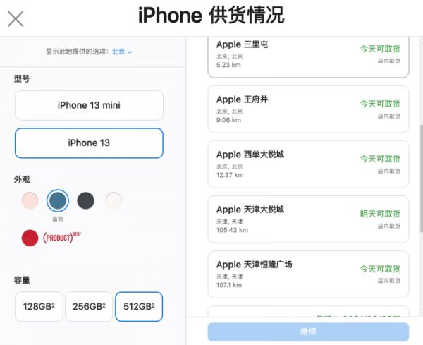 iPhone 13部分颜色和内存目前在北京仍有现货。来源:苹果官网