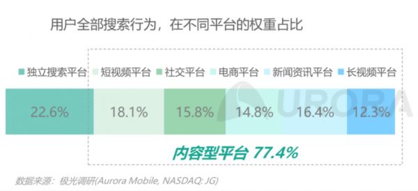 去年,极光大数据发布了内容搜索趋势报告,报告显示内容平台的搜索比重占到77.4%,而独立搜索平台的比重为22.6%,在App愈发丰富的时代里,“随看随搜”更符合用户的使用习惯。其次,因为一些原因独立搜索引擎检索不到一些平台内的内容,或是专业内容平台里的内容质量更高,使得用户更愿意使用专门的内容应用。