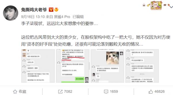 9月16日,微博大V@兔撕鸡大老爷爆料指出李子柒“远远比大家想象中的要惨”,在与资本之争中最后可能因股权架构“颗粒无收”。关于李子柒与“微念”的热议更上一层楼,无数网友同情李子柒的遭遇,痛骂资本“嗜血”,但亦有网友指责李子柒身价倍涨后“渴望更多”。