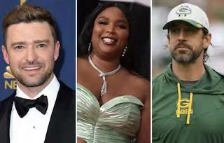 (左起)Justin Timberlake、Lizzo 和 Aaron Rodgers