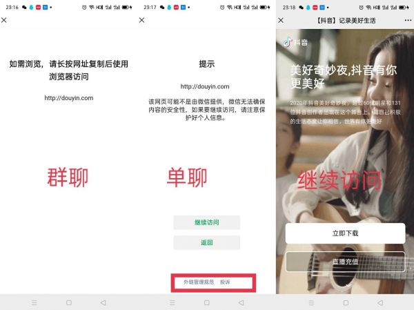 另外,douyin.com网址链接在微信群聊中不能直接访问,在单聊场景下点击了之后有“继续访问”入口,同时页面有安全提示内容显示,还有“外链管理规范”和“投诉”入口。若点击“继续访问”入口之后,并不能直接跳转到抖音的短视频首页,而是出现“立即下载”和“直播充值”两个选项入口,我们继续往下点击,页面迟迟不能出现反应。