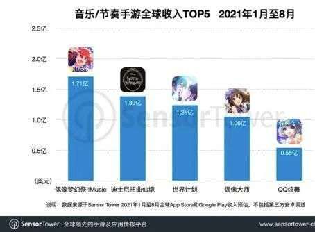 在今年前8个月,《偶像梦幻祭!!Music》拔得音乐/节奏类手游头筹,付费超过1.7亿美元。另外几部产品分别为《迪士尼扭曲仙境》和初音未来授权手游《世界计划》,二者分别以1.39亿和1.25亿美元分列第2和第3名。