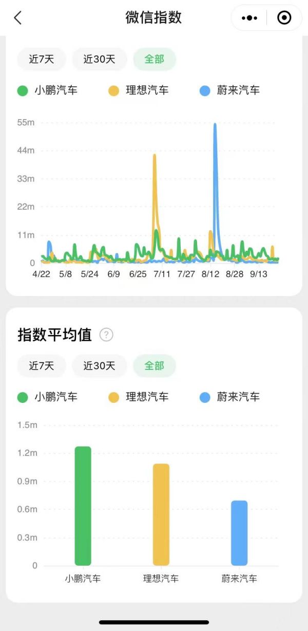如果对比“蔚小理”三家造车新势力的微信指数,小鹏汽车的指数数据远高于其它两家。为什么七月份和八月份蔚来和理想汽车的指数突然暴增?那是因为当时出现了负面危机,一个水银事件,一个企业家车祸身亡。