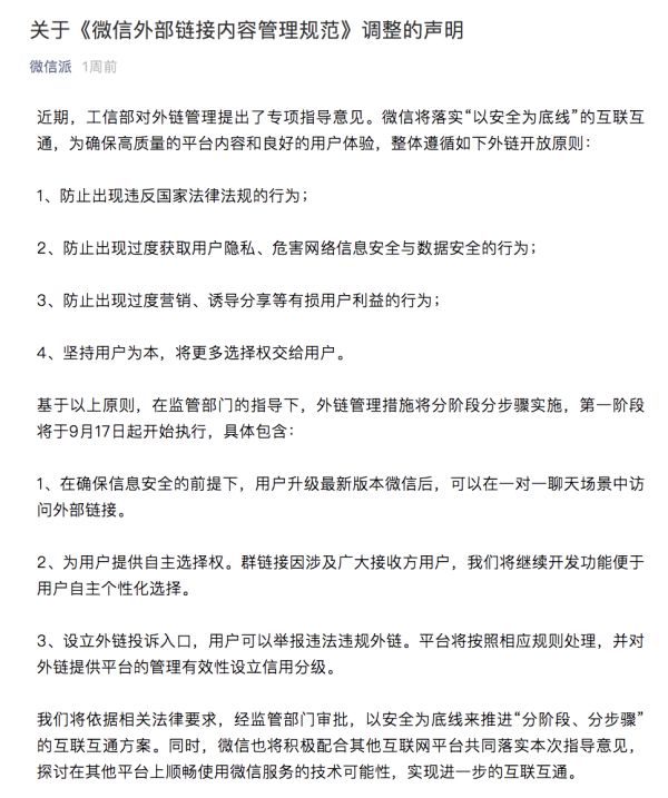 眼见互联网“解除屏蔽”大限降至,9月17日,腾讯发布关于《微信外部链接内容管理规范》调整声明,表示将在“安全为底线”前提下,以“四项原则三条措施”实施第一阶段的互联互通。具体包含三项举措:用户可以在一对一聊天场景中访问外部链接、开发功能便于用户自主选择接收群链接,以及设立外链投诉入口。
