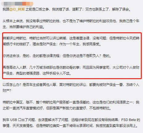 特斯拉认为,目前“韩先生多次在微博平台就与我司有关的诉讼案件陈述单方观点和意见,部分内容可能给网友造成一定的误解,为此我们不得不发声对相关问题作澄清。”并在声明中,具体回应了韩潮此前在微博上的关于“赔偿款未到账”等问题。