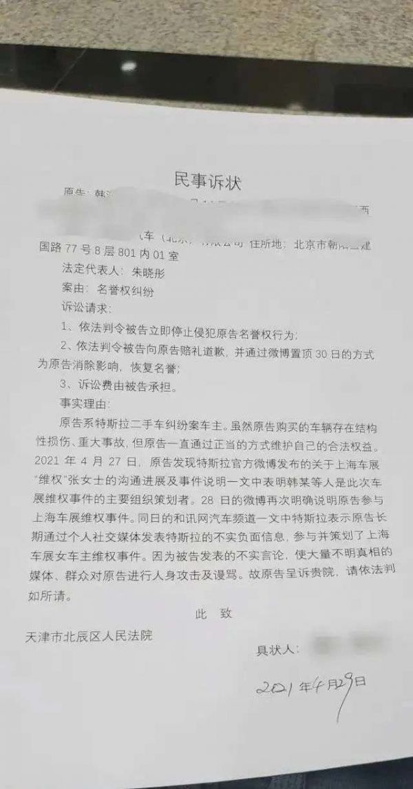 与此同时,一纸诉状飘然而至:特斯拉起诉韩潮侵犯名誉权,要求后者赔偿500万元+公开赔礼道歉。
