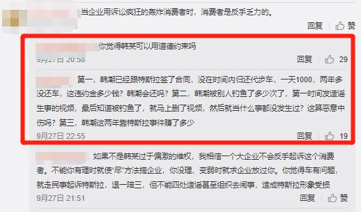 也有车友认为,韩潮在整个事件中并非“洁白无瑕”,在代步车等纠纷上存在过失,特斯拉维护自身权益并无问题。