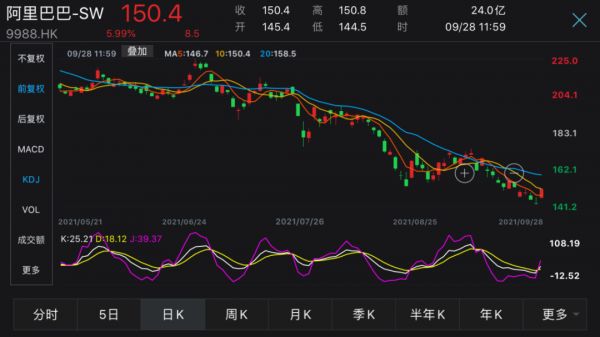 28日上午,阿里巴巴港股高开高走,截至午间休盘,大涨5.99%,每股报150.4港元,市值飙升1843亿港元(约合人民币1528亿元),目前总市值为3.26万亿港元。