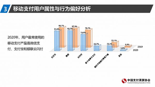 值得注意的是,在移动支付市场,支付宝和微信支付合计份额超过90%。而据中国支付清算协会今年年初发布的《2020年移动支付用户问卷调查报告》显示,2020年,微信取代支付宝,成为了用户最常使用的移动支付产品。