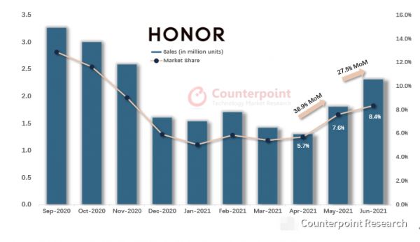 根据Counterpoint此前发布的一份荣耀过去12个月份的月度销量和市场份额变化图显示,2020年12月至2021年4月是荣耀手机月度销量和市场份额最低迷的时期,4月之后便开始逐步回升。