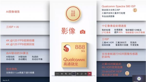 其实,骁龙888本身集成的三个ISP性能已经非常优秀了,支持低光架构、AI图像增强、支持单帧逐行HDR图像、十亿像素级处理速度等特色功能。