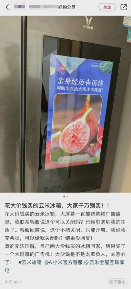 据网友描述,花大价钱买的云米冰箱,大屏幕一直推送购物广告信息,并且无法关闭。“我联系客服说这个可以关闭吗?已经影响到我的生活了。客服回应说,这个不能,只能开启。我说我充会员,可以给我关闭吗?结果没回复!真的无法理解,自己花大价钱买的冰箱回家,结果买了一个大屏幕的广告机!”