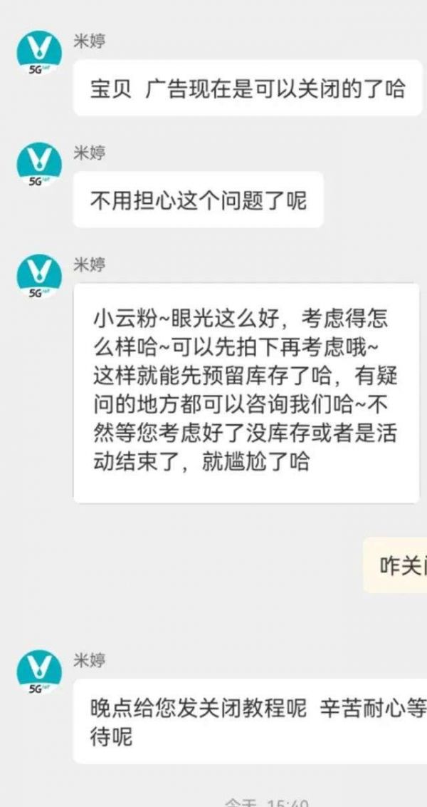 随后在被问到需要多久设置一次时,对方表示广告现在已经可以关闭,但晚点才能发送关闭教程。