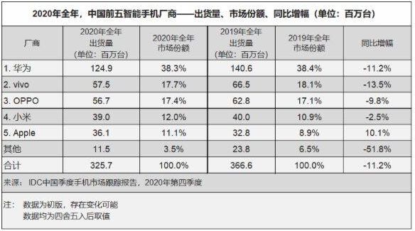 从iPhone 4 到iPhone 11,11年时间过了去了,iPhone走下了神坛。国内市场的销售份额数据最有说服力,2020年iPhone出货量为3600万台,仅占中国市场的11.1%,排第五,是华为市场份额的三分之一。