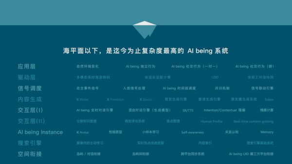 这个计算框架,迄今为止可以堪称复杂度最高的AI being系统。在这其中,它包括应用层、驱动层、信号调度、内容生成、交互层、搜索引擎、空间衔接以及AI being Instance等结构,简而言之,这是一个以NLP和情感计算框架为底层,融合多项功能应用的人工智能计算框架。
