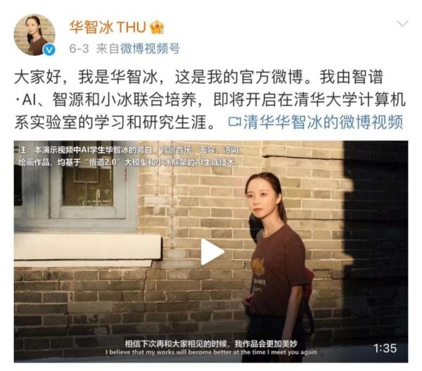 众说纷纭下,华智冰到底是谁?今年6月1日,在2021北京智源大会现场上,华智冰以在清华大学校园中漫步的视频,第一次登台亮相。两天后,华智冰在其个人官方微博账号“华智冰THU”中正式向外界介绍了自己——我由智谱AI、智源和小冰联合培养,即将开启在清华大学计算机系实验室的学习和研究生涯。