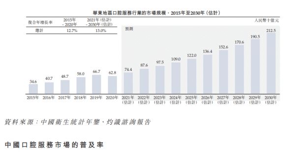 市场方面,根据灼识谘询报告,中国口腔服务市场的市场规模由2015年的923亿元增至2020年的1628亿元,复合增长率为12%;预计到2030年将达到约5262亿元,复合年增长率为11.8%。这意味着口腔服务市场在未来有着不错的发展空间。