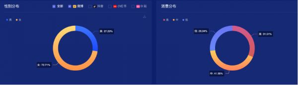 从用户画像来看,李子柒女性受众占比达72.71%,男性用户占比27.29%;中高消费力的人群合计73.06%。中高消费女性占主流受众,也意味着李子柒品牌IP具有大量商业变现的价值空间。