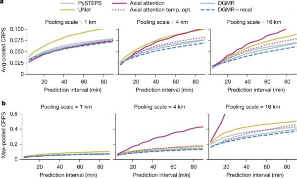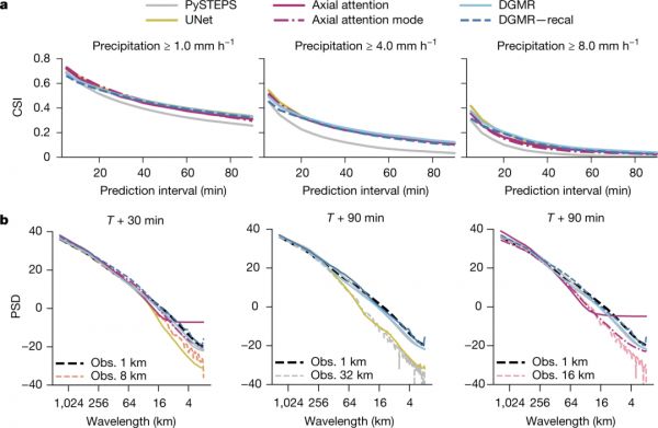 结果表明,DeepMind的深度生成模型可以提供更好的预测质量、预测一致性和预测价值。模型在1,536公里×1,280公里的区域内产生了逼真且时空一致的预测,提前期为5-90分钟。