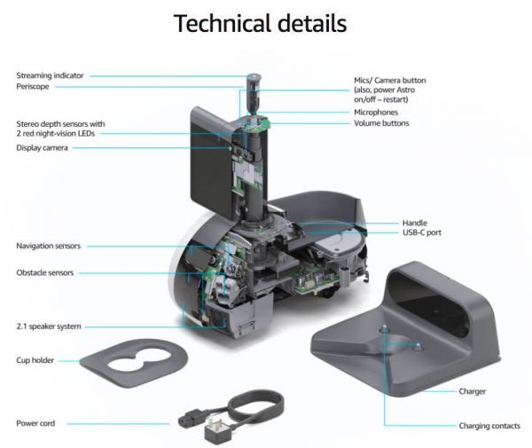 Astro 高2英尺,重20磅。它的主驱动轮直径约为12英寸,Astro的最高速度为每秒3.3英尺。屏幕类似于 Echo Show 10,机器人使用 5 兆像素视频通话摄像头。为了保护用户的隐私,用户只需按一下按钮即可关闭Astro的麦克风、摄像头和动作,并为机器人设置禁行区。