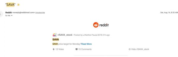 但是八月中旬的时候,一位朋友谈起了Cassava Sciences($ SAVA)。这支股票已经从最近的低点位置爬到几乎翻了一番(从约 65美元涨到130美元),他说这会彻底概念医学或别的东西。我曾经听说过这只股票,但从来都没有给予太多的关注。我曾经进 r/SAVA里面逛了一下,几天后,我收到的 Reddit 每日摘要电子邮件是这样的。