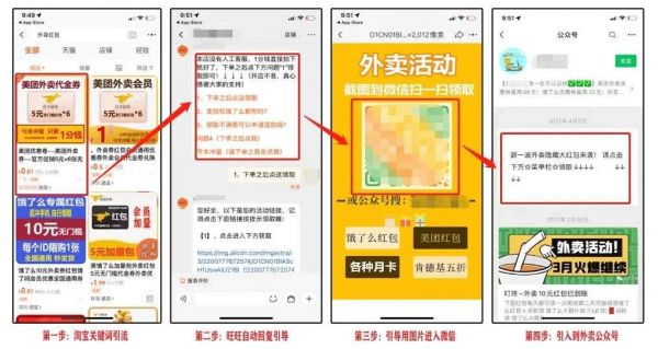 诸如在淘宝或闲鱼,他们会以0.01元价格的超低价,然后提前埋伏好外卖优惠券、外卖红包等关键词进行引流,吸引用户成交购买优惠券。客户成交后,再通过旺旺的自动回复功能,将客户指引到指定的微信公众号中获取外卖红包,然后再通过提前预置好的关键词回复中,为用户推送其推广的外卖红包券,进而达成自动化引流和获客。