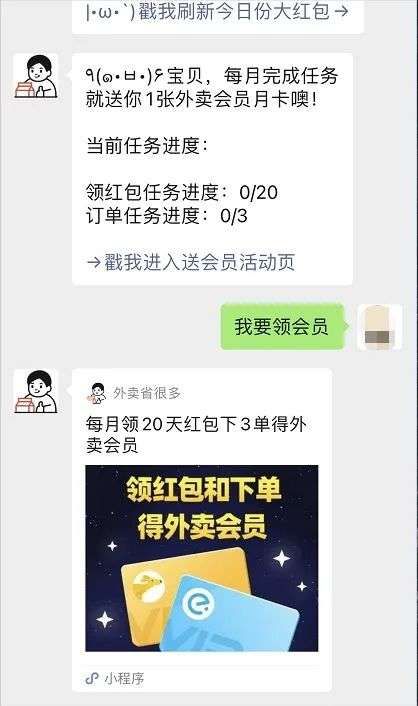 比如,不少外卖CPS小程序或者公众号,经常在用户刚刚关注平台,或者在页面显著的位置为用户推送,诸如连续领外卖红包打卡赢外卖会员红包的活动(如下图),来培养吸引用户留存,同时借助会员红包来吸引用户多次到该平台领红包点外卖,进而培养用户到平台先领红包再点外卖的习惯,最终达到长久存留和转化的目的。
