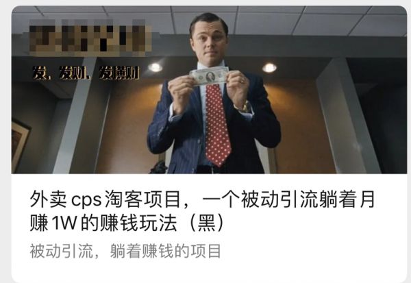 渐渐的,市场上关于“外卖优惠券推广教学&技巧”的软文显著增加,他们通常打着“轻松兼职,月入过万”“免费黑产,流水过百万”“外卖CPS快速引流的套路”之类的标题,然后以资深从业者或者行业大佬的身份为大家分享,外卖CPS的快速赚钱之道。