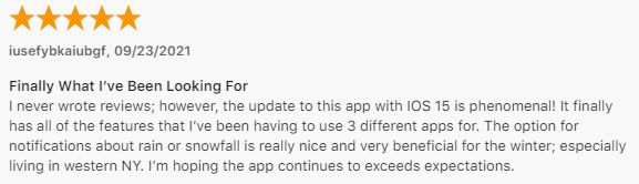“我从不写评论,但是 iOS 15 对 Weather App 的更新令我感到惊讶:它终于具备了我之前用的三款不同天气 App 的所有功能!下雨或下雪的通知选项真的很好,冬天非常有用,尤其是对我这种住在纽约西部的人。我希望这款 App 能继续超出预期。”