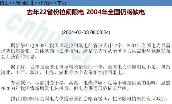 在2003年6月份,据统计有16个省市采取过限电措施;8月份,这一数字变成了19个;到年底,总共已有22个省市拉过闸;而到2004年1季度结束的时候,这个数字进一步上升到了24个。