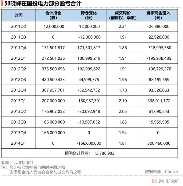 邓晓峰管理的博时主题行业和社保一零三组合从2011年三季度开始布局国电电力,在2014年一季度悉数离场。如果按当季平均成交价计算,邓晓峰动用了十亿级别的资金,但历时两年多,只赚了一千多万。