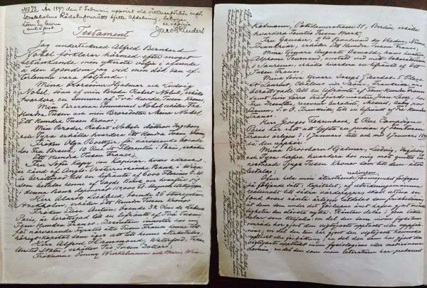 诺贝尔在1895年11月27日签下遗嘱(图为遗嘱的前两页) | The Nobel Foundation
