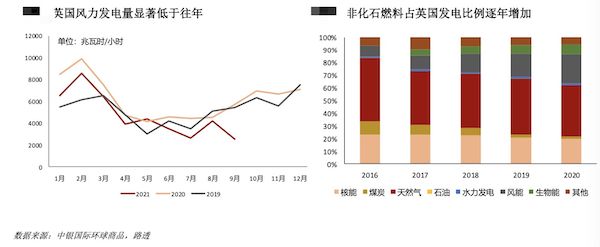同时,新能源发电不足无疑加大了传统能源的需求。风力发电是欧洲发电的重要组成部分,其中,英国风力发电占2020年全英供电比例高达23%。但风力发电供应不稳定,受天气情况影响,风力发电量减少,一部分电力需求缺口需要由天然气来补充。英国风力发电量9月均值为2500兆瓦时/小时,远低于去年同期水平(5700兆瓦时/小时)。