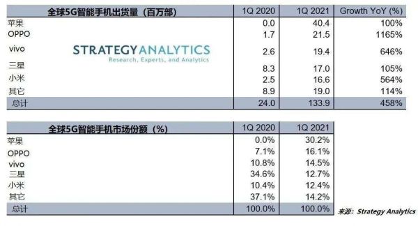 近期,Strategy Analytics 发布了 2021 年 Q1 全球智能手机出货量排行榜,数据显示:Q1 全球智能手机总出货量为 3.4 亿台,同比增长 24%。在榜单前五中,国产手机占据 3 席,并且在市场份额方面紧接苹果。