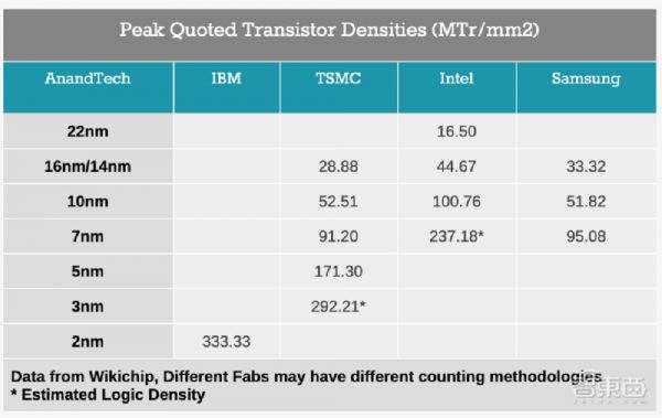 ▲IBM、台积电、英特尔、三星各制程节点晶体管密度对比(来源:AnandTech)