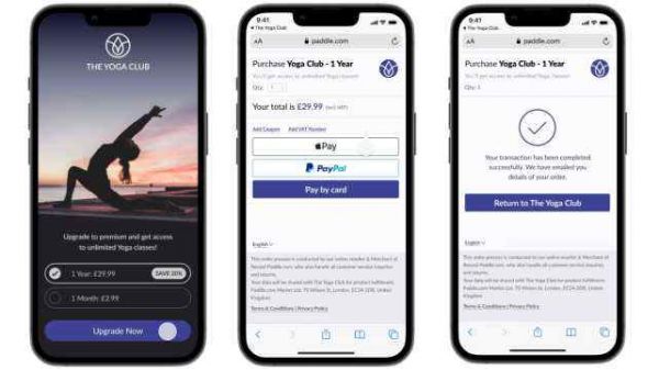 Paddle提供的一款软件开发工具包(SDK)允许应用开发商通过“立即升级”按钮为用户提供月度或年度订阅服务。这个按钮能跳转到Safari浏览器中一个由Paddle托管的网页,其中有Apple Pay和PayPal等几个支付选项。支付完成后,用户会返回到应用程序中。