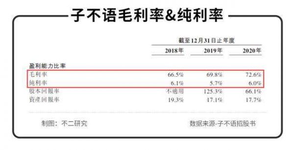 再看子不语的毛利,2018~2020年分别为8.76亿元、9.98亿元、13.78亿元,毛利率66.5%、69.8%、72.6%,年复合增速为19.37%。