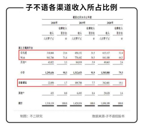 据子不语招股书显示,其收入来源按销售渠道划分,主要分为第三方电商平台和自营网站(以及其他)。2018~2020年,来自第三方电商平台的收入分别占比98.3%、91.9%和79.3%。