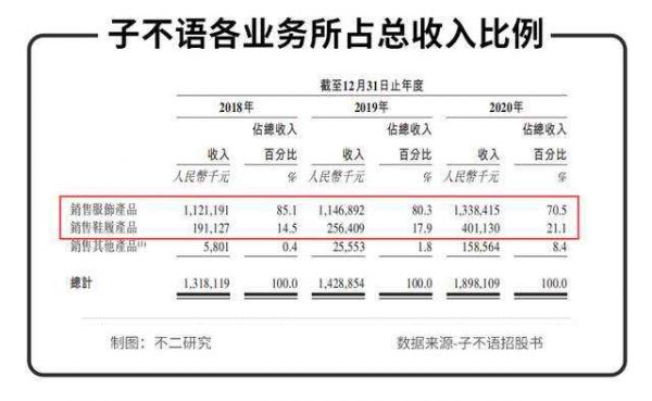 尽管近年来调整产品结构,但据其招股书显示,2020年销售服饰产品占总收入的70.5%,鞋履产品占据21.1%,两者的营收占比之和高达90%以上,这也意味着其品类依赖症同样风险高企。