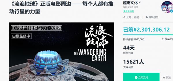 和国外的一片红海相比,国内影视周边市场并非悄无声息。比如2019年开年巨作《流浪地球》与哔哩哔哩旗下超电文化合作的周边众筹金额数百万,超目标十倍有余。