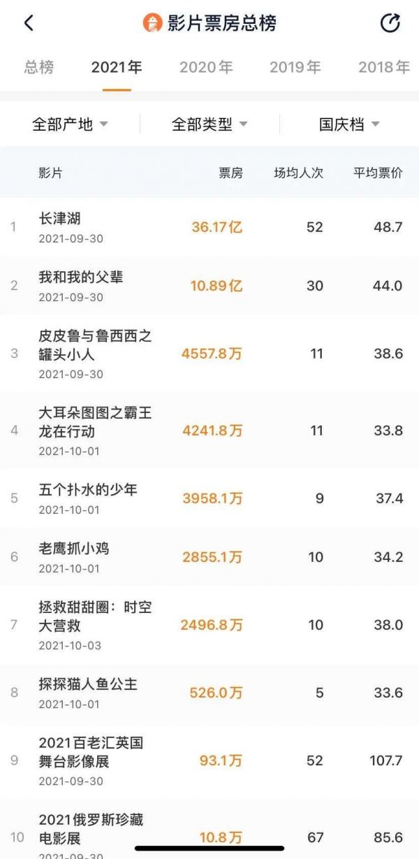 国庆档两部主旋律大片《长津湖》《我和我的父辈》领跑票房榜,《长津湖》票房为31.94亿,跻身中国电影影史票房第八名。《我和我的父辈》票房则达到9.62亿,位列国庆档第二。