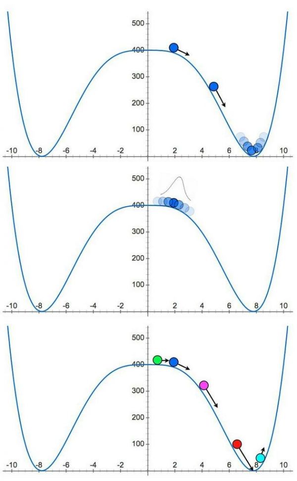 当球滚入谷底,暴胀就会终止(上图)。但暴胀场具有量子特性(中图),会随着时间不断扩张。在许多区域内的暴胀停止时(紫色、红色和蓝绿色),还有许多空间内的暴胀仍在持续,并且有可能永远持续下去(下图)。